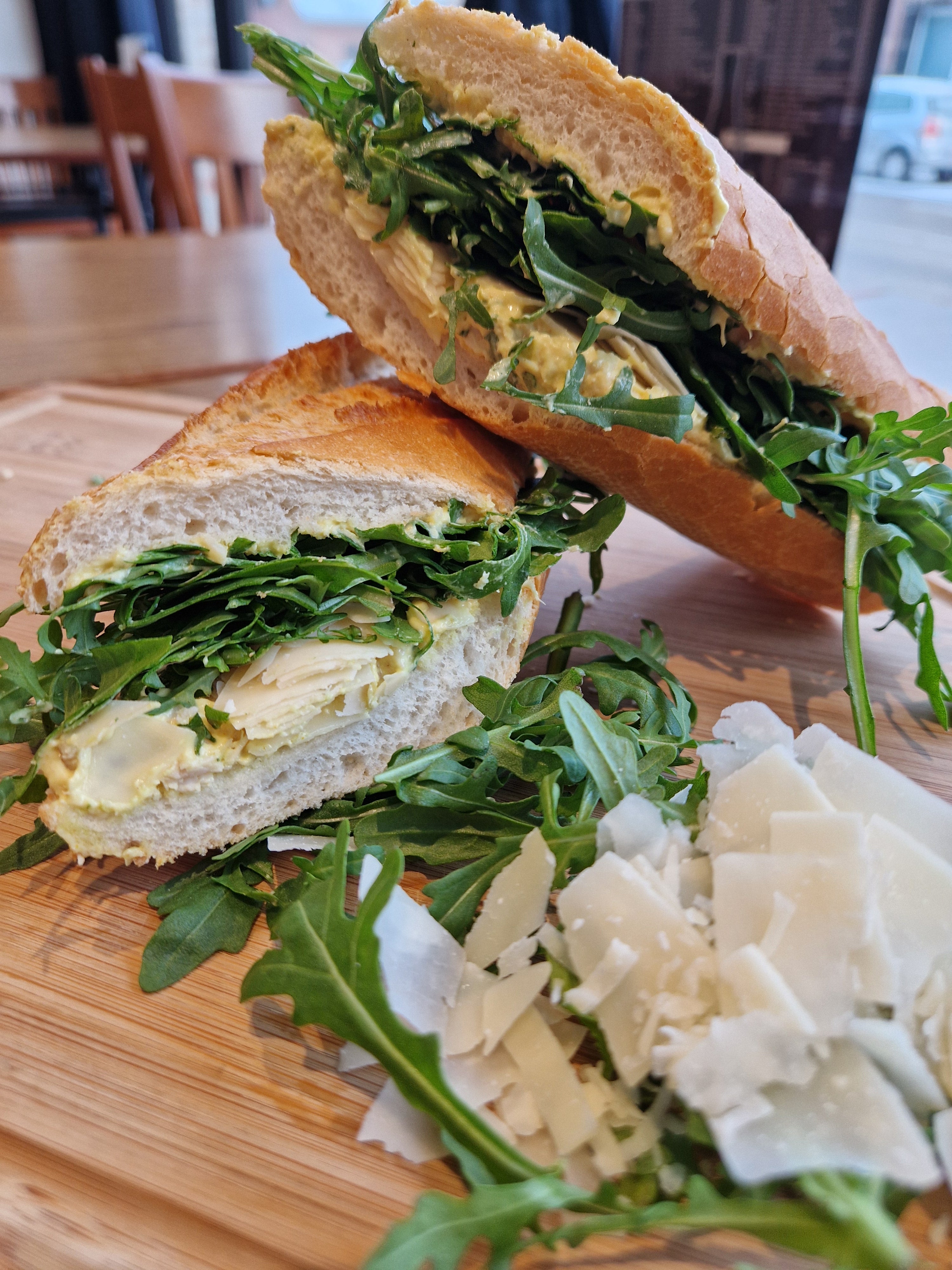 Maandelijkse proever Januari 5,20€ Broodje met huisgemaakte kipcurry - ruccola - paramazaanschilfers.